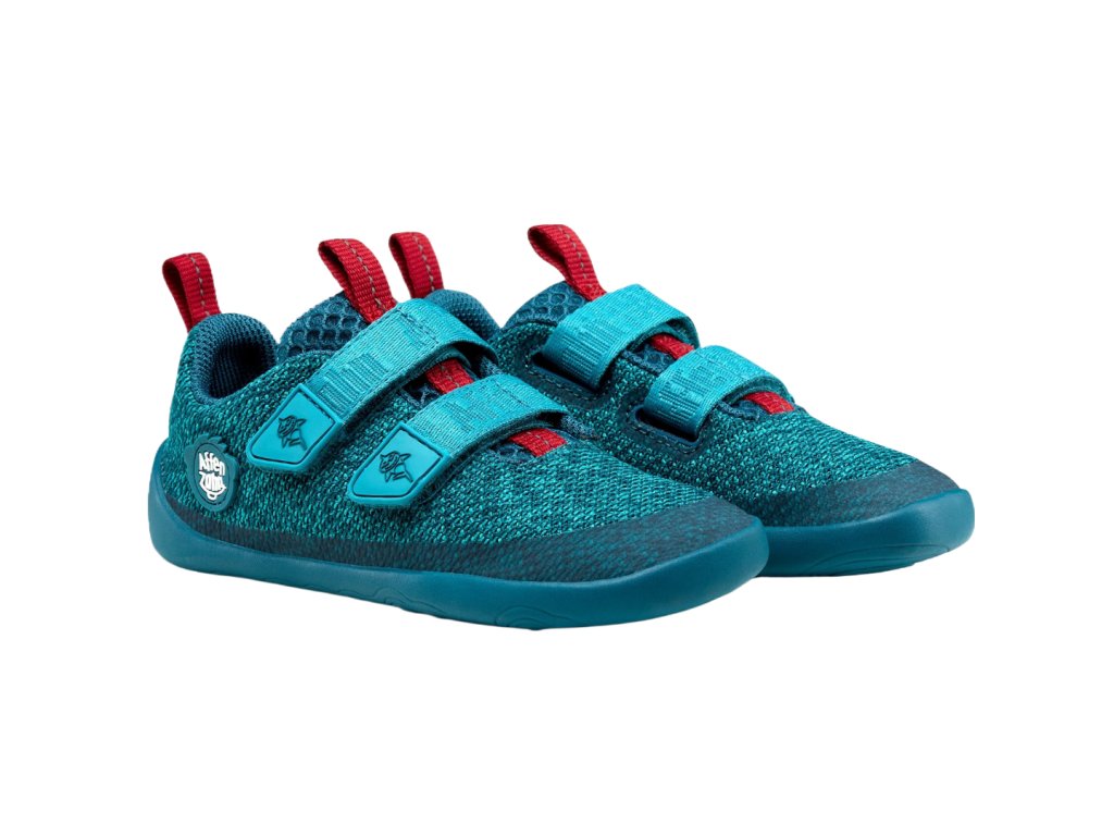 Dětské úpletové barefoot boty ergonomického tvaru - veganské. Díky tenké, ohebné a neklouzavé podrážce umožňují přirozenou dynamiku chůze a postupné odvalování chodidla. Boty jsou vyrobeny z polyesterového vlákna a zapínají se pomocí suchých zipů, takže děti nebudou mít s obouvání žádný problém.