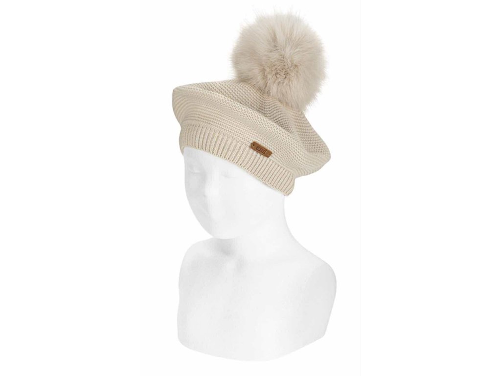 Baret s pružným lemem a velkou bambulí z umělé kožešiny.