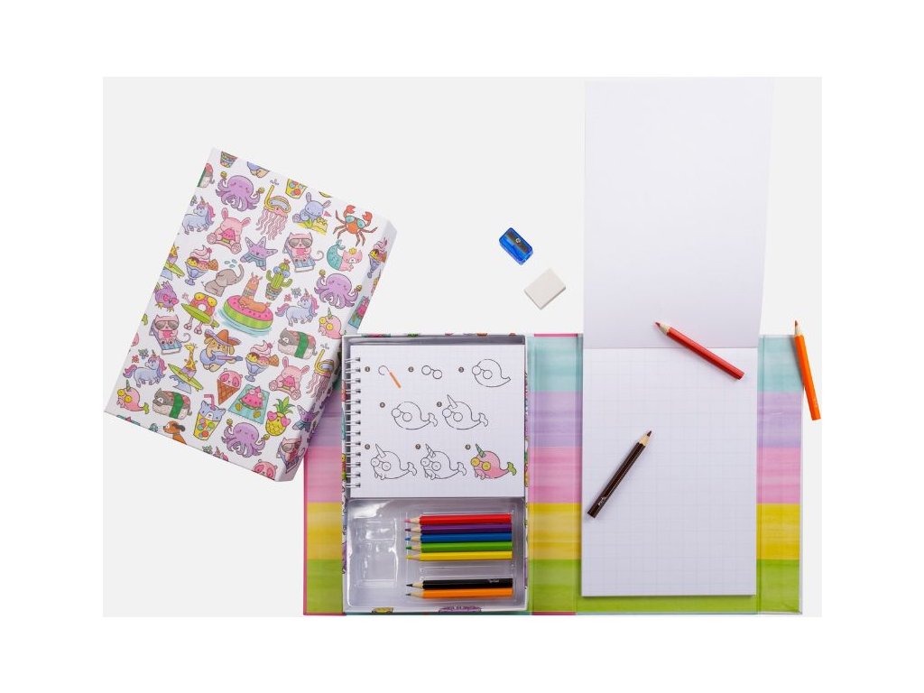 Každá sada obsahuje 24 spirálově vázaných stran s pokyny pro kreslení krok za krokem, skicovací blok s mřížkou 36 stránek, 1 HB a 9 barevných tužek, ořezávátko a gumu.