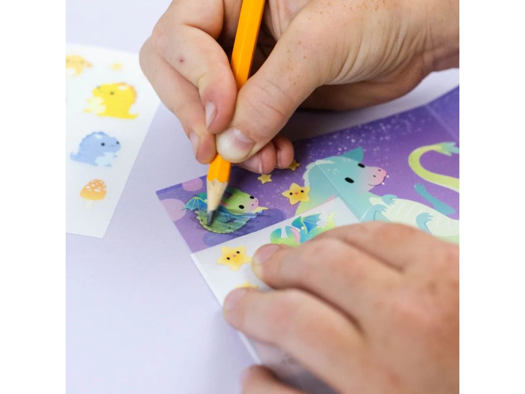 Transfer Magic je velmi snadná aktivita, kterou si můžete vzít kamkoli s sebou a nevzniká při ní žádný nepořádek. Stačí si vybrat přenosový list s ozdobami, odstranit podkladový papír, umístit vybraný obrázek lícem dolů na kartu s pozadím jednorožce a přetřít jej pomocí přiložené stírací tužky.
