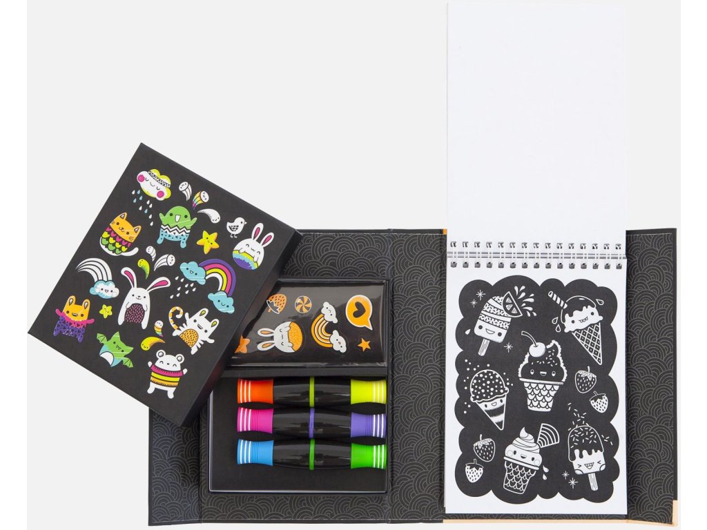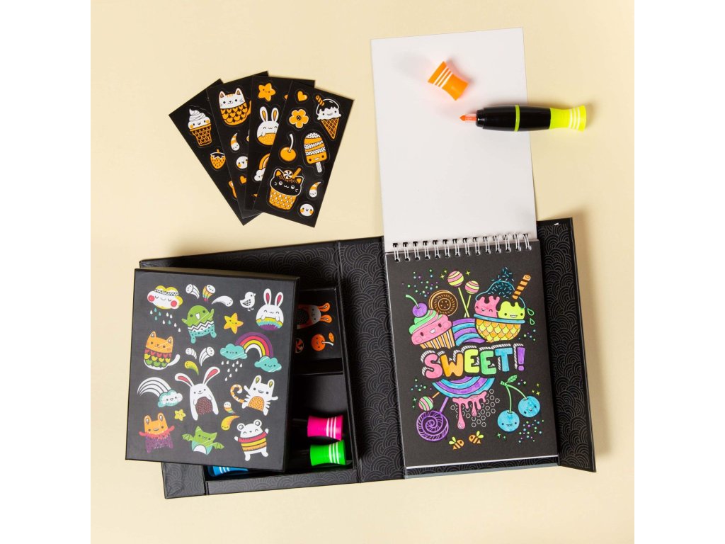 Tato neonová sada je nabitá aktivitami. Balení obsahuje neonově zbarvené fixy a nálepky. Vše, co děti potřebují, je v samostatné krabičce s magnetickou chlopní pro bezpečné uložení obsahu.