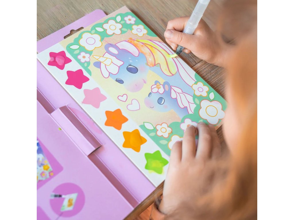 Kompaktní sada na malování s jednorožci s vestavěnými akvarelovými barvami, vodním štětcem a houbičkou. Díky magnetickému zapínání a vysouvacím kartám je ideální na cesty i pro domácí tvoření malých umělců.