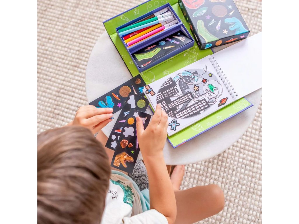 Děti mohou odstartovat do galaxie a vydat se na dobrodružství mezi hvězdami, planetami a asteroidy, a přitom být svědky toho, jak t-rex jezdí na vesmírné lodi v této svérázné barevné sadě.