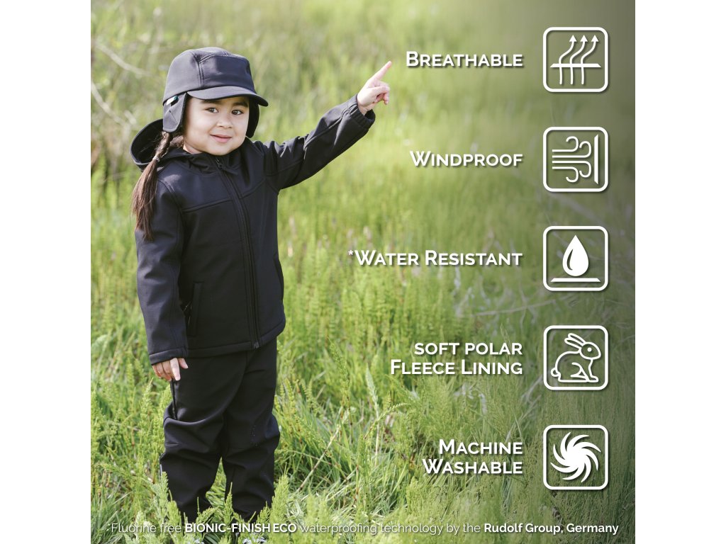 Softshellové bundy jsou vyrobeny se čtyřmi vrstvami ochrany proti chladu a dešti. Technologie Bionic Finish ® Eco DWR odpuzuje vítr, vodu a nečistoty, je zesílena větruodolnou tkaninou s vysokou hustotou a nepromokavou TPU membránou. Vnitřní vrstva měkkého fleecu udrží vaše děti v teple! Naše technologie odpuzující větru a vodu neobsahuje škodlivé chemikálie, jako je fluor a PVC, takže si můžete být jisti, že je pro vaše děti bezpečná!