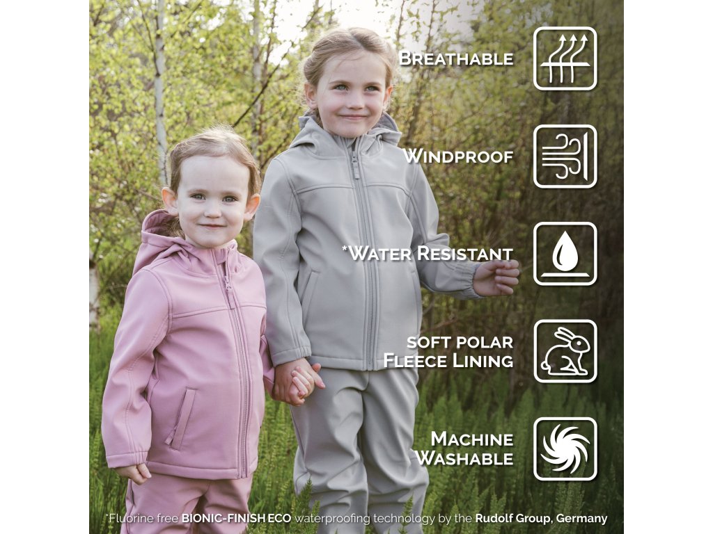 Softshellové bundy jsou vyrobeny se čtyřmi vrstvami ochrany proti chladu a dešti. Technologie Bionic Finish ® Eco DWR odpuzuje vítr, vodu a nečistoty, je zesílena větruodolnou tkaninou s vysokou hustotou a nepromokavou TPU membránou. Vnitřní vrstva měkkého fleecu udrží vaše děti v teple! Naše technologie odpuzující větru a vodu neobsahuje škodlivé chemikálie, jako je fluor a PVC, takže si můžete být jisti, že je pro vaše děti bezpečná!