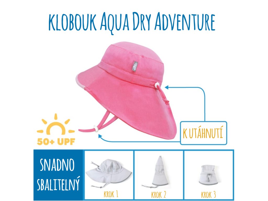 Ochrana proti UV záření u našeho klobouku Aqua-Dry je zajištěna tkaninou a střihem klobouku. Tento kbelíčkový styl je díky rychleschnoucí vodoodpudivé tkanině ideální na vodní hrátky nebo nečekanou dešťovou přeháňku. Má ochranný faktor UPF 50+ a je bezpečný pro děti bez přidaných škodlivých chemikálií, barviv a roztoků.