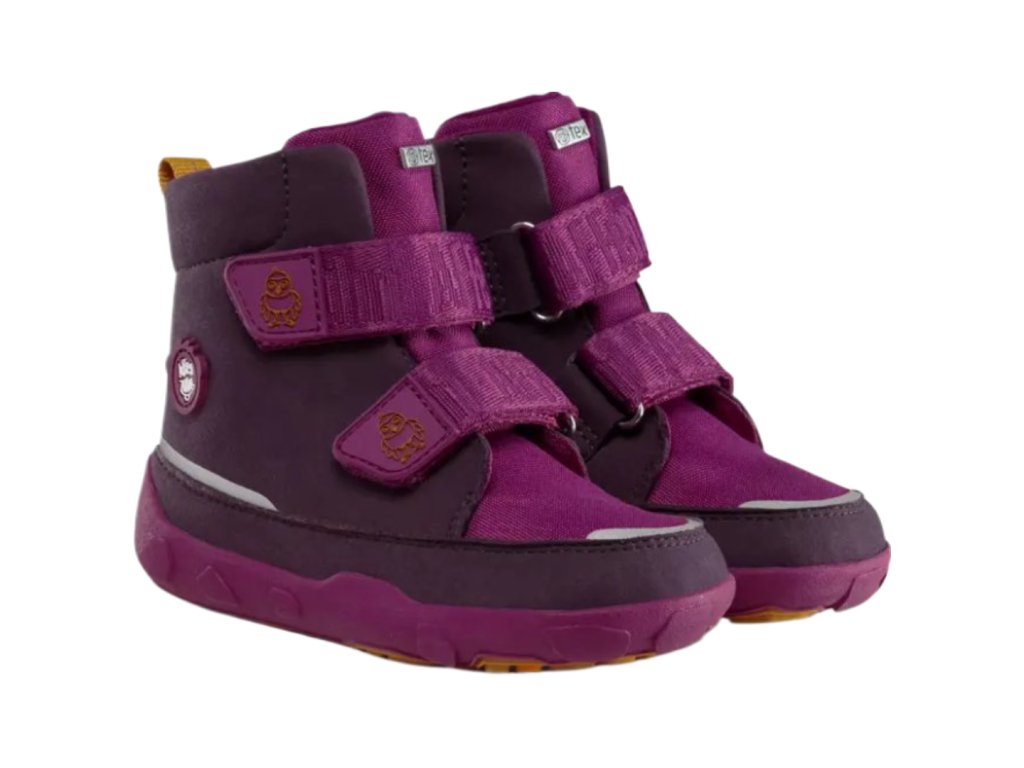 Dětské zimní barefoot boty na suchý zip, jsou ergonomického tvaru s tenkou neklouzavou podrážkou, voděodolnou a prodyšnou membránou Affentex a nově více reflexních prvků